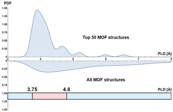 Comparison of the smoothed probability density distribution (PDF) of pore limiting diameter (PLD) for the best 50 MOFs and for all MOFs considered in this study for the VSA separation process. At the bottom of the figure is the PLD range that comprises over 90% of the Top 50 MOFs database.