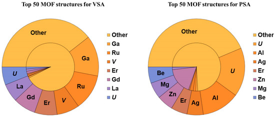 In this study, structure–adsorption performance relationships were investigated. Two databases with Top 50 MOFs based on the APS metric were constructed for the VSA and PSA separation processes. Then, smoothed probability density distributions (PDF) were built for several structural parameters for the database of all studied MOFs and for the databases of Top 50 MOFs for the VSA and PSA separation processes. These structural parameters included pore limiting diameter, largest cavity diameter, accessible surface area, accessible pore volume, density and porosity. The range of effective structural parameters was determined using a criterion that this range included more than 90% of Top 50 MOFs. The importance of each structural parameter was estimated by comparing PDFs for all studied MOFs and Top 50 MOFs. If PDFs were about the same for both databases, this structural parameter was considered to have little effect on the adsorption performance. Meanwhile, if PDFs were very different and PDF for TOP 50 MOFs had a narrow distribution, it was possible to claim that certain range of optimal parameters existed. For instance, Figure 3 demonstrates that for the VSA separation process there is a narrow range 3.75 Å < PLD < 4.8 Å corresponding to more than 90% of Top 50 MOFs, and PDF for them is different from PDF for all MOFs. So, the following optimal structural parameters were determined for VSA (Figure S8): 3.75 Å < PLD < 4.8 Å, 4.4 Å < LCD < 6 Å, 100 m2/g < ASA < 700 m2/g, 0.02 cm3/g < AV < 0.09 cm3/g, 1300 kg/m3 < density < 2500 kg/m3, 0.04 < VF < 0.15. For PSA the optimal ranges are wider (Figure S9): 3.75 Å < PLD < 6.3 Å, 4.2 Å < LCD < 7.1 Å, 300 m2/g < ASA < 1400 m2/g, 0.03 cm3/g < AV < 0.18 cm3/g, 900 kg/m3 < density < 2500 kg/m3, 0.05 < VF < 0.2. To determine the chemical composition–adsorption performance relationships, the probabilities of finding certain metal atoms in the MOF structure were calculated for all the studied MOFs and the database of Top 50 MOFs for the VSA and PSA separation processes (Figure 4). Ga, Ru, V, Er, Gd, La, U and Ca were found to be the most suitable metals for the VSA separation model based on the probabilities of their presence among Top 50 MOFs and all studied MOFs. Meanwhile, the most widespread metal atoms Zn, Cu, Cd, Co and Mn (present in 54.7% of all MOFs) were scarcely present among Top 50 MOFs (less than 10%). In the case of the PSA model, U, Al, Er, Be and Mg were found to be the most suitable metals. Characteristics of the most promising MOFs (Top 10) for the VSA and PSA separation processes are reported in Tables S6 and S7. As the pressure increase leads to a much more significant selectivity decrease than the adsorption capacity increase, the best MOFs for VSA have higher APS than the most promising MOFs for PSA.