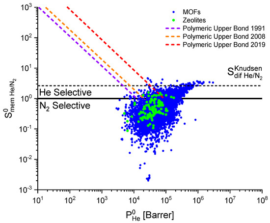 The perspectives of using MOFs and zeolites as membrane materials for separation of He and N2 can be estimated by comparing calculated selectivity and permeability with the upper bonds obtained in different years for polymeric membranes. Upper bond is an empirical relation where constants k and n are determined from the selectivity vs. permeability graph for experimental data on He/N2 separation over various polymeric membranes. Figure 6 presents upper bonds obtained by Robeson in 1991 [72] and 2008 [12] and by Wu et al. in 2019 [73]. The upper bonds for polymeric membranes demonstrate that the best MOFs and zeolites trail polymeric membranes in selectivity but have higher permeability . Based on this fact, several variants of using MOFs and zeolites for separation of He and N2 are possible: creation of materials from a combination of polymers and MOFs/zeolites or using MOF/zeolite materials selective to nitrogen. In the former case, combination of materials can result in the growth in permeability (in comparison with polymeric membranes) and increase in helium selectivity (in comparison with MOFs/zeolites). In several publications [49,50,51] it was shown that such an approach makes it possible to obtain more efficient materials for separation of different gas mixtures than using MOFs along as the membrane materials. However, due to the low membrane selectivity of MOFs and zeolites to helium, apparently, any other mesoporous materials with the membrane selectivity close to the Knudsen diffusion selectivity can be used for separation of helium and nitrogen. In the second case, if MOFs or zeolites selective to nitrogen are used as the membrane, the retentate will be enriched with helium and the permeate will be enriched with nitrogen. As using MOFs and zeolites as membrane materials is more promising in the second case, Top 50 frameworks most selective to nitrogen ( > 22.6) were identified. Not a single zeolite was included in this list.