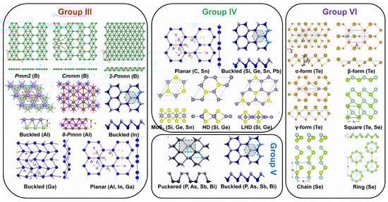 In group III elements, theoretical calculations have predicted many allotropes of 2D borophene (B1−ν☐ν; ν represents the vacancy concentration) with various vacancy concentrations and 2D aluminene with various forms [55,59,60,61]. However, only two allotropes of 2D gallenene (buckled and planar structures) have been successfully exfoliated [29]. Similarly, 2D indiene has been predicted to possess buckled, planar, and puckered geometry [62]. Among group IV elements, the favorable hybridization state is somewhere between sp2 and sp3, leading to various 2D allotropic structures, such as planar honeycomb graphene/stanene [63,64,65], buckled silicene/germanene/stanene/plumbene [25,30,66,67], pha-/penta-graphene [68,69], MoS2-like stanene [57], and honeycomb dumbbell (HD)/large honeycomb dumbbell (LHD) silicene/germanene [57]. Different from group III and group IV, all the elements in group V prefer the sp3 hybridization state to create buckled (α-form) or puckered (β-form) lattices [24,70,71,72,73,74,75]. Meanwhile, a γ-form and a δ-form of arsenene have also been proposed [56]. In group VI, four different allotropic forms of tellurene have been predicted [27,58], while Se can form a chain, a ring, or a square structure [58]. To verify the atomic structures of various elemental Xenes, epitaxial growth has been attempted on many substrates, analogous to the epitaxial growth of graphene. The suitable substrates for the epitaxial growth of various non-graphene Xenes (Figure 3) reveal that the substrate choices affect whether the synthesis can succeed in addition to an allotropic lattice structure.