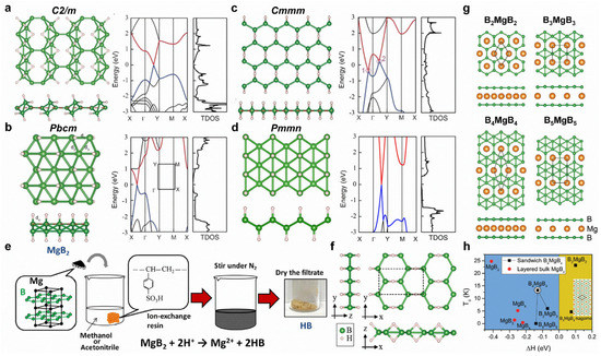 The physical and chemical properties of borophene can be tuned using surface modifications, such as hydrogenation, fluorination, doping, intercalation, strain, etc. Young’s modulus of borophene decreases after hydrogenation or fluorination. Furthermore, hydrogenation can lead to Dirac cones with massless Dirac fermions in C2/m, Pbcm, and Pmmn structures, while Cmmm structures exhibit Dirac ring features (Figure 4a–d) [107]. Interestingly, BH sheets have been successfully prepared from MgB2 by using the cation exchange method (Figure 4e,f) [108]. For Mg intercalation, the intercalated bilayer borophene (B2MgB2) can exhibit good phonon-mediated superconductivity with a high Tc of 23.2 K (Figure 4g,h) [102]. Moreover, tensile strain in borophene is beneficial for superconducting [106]. Li-doped borophene–graphene heterostructure shows gas-sensitive properties, and this is promising for borophene-based gas sensors [109].