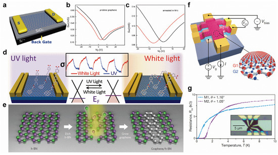Graphene’s distinct physical characteristics make it potentially useful for field-effect transistors (FET), sensors, transparent conductive films, energy devices, etc., but its intrinsic gapless character still constrains its further applications. First, heteroatom-doping or chemical adsorption can effectively tune the electronic properties of graphene. N-doping can not only induce an n-type-doping effect (Figure 6a–c) [118] but can also give rise to p-type-doping with different configurations of N substitutions. For example, graphitic N induces n-type-doping, but pyridinic N induces p-type-doping [119]. In addition, B-doping can introduce p-type transfer characteristics [120]. Chemical functional groups can also produce various doping effects. For example, the adsorption of spiropyran and DR1P molecules introduce n-type and p-type-doping to graphene, respectively [36,121]. Moreover, light can reversibly switch the molecular transformations, resulting in the controllable shift of the Dirac point of graphene (Figure 6d) [36,121]. By seamlessly and precisely stitching the domains of graphene and h-BN (Figure 6e), the hybrid atomic layers of in-plane heterostructures can be applied for intriguing electronic applications [42,122]. Interestingly, in the proper twisted angles of bilayer graphene, the electronic band structure shows flat bands near Fermi energy, resulting in the correlated insulating states at half-filling and unconventional superconductivity with a Tc of 1.7 K (Figure 6f,g) [52].