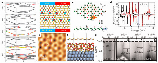 Due to the limitations of the poor air stability of silicene, it is difficult to experimentally perform surface modifications on silicene. Theoretical investigations on the surface modifications of silicene focus on doping, strain, hydrogenation, intercalation, and chemical adsorption. Transition metal adsorption can induce various doping effects in silicene (n-type via Cu, Ag, and Au adsorption; p-type via Ir adsorption; and neutral type via Pt adsorption in Figure 7a) [135], and so can applying strain [136]. Moreover, Mn-doping can induce a ferromagnetic state in silicene, which can be transformed into an antiferromagnetic state with the application of biaxial strain (Figure 7b) [137]. Under a certain level of pressure strain, the spin-orbit bandgap of silicene will increase from 1.55 to 2.9 meV [16]. One-side semi-hydrogenation can introduce ferromagnetism to silicene, as well as make it semiconducting with a direct bandgap of 1.74 eV (Figure 7c,d) [138]. Oxygen intercalation into underlying silicene on a Ag(111) surface can effectively reduce the orbital hybridization of the top-layer silicene and Ag substrate, leading to massless Dirac fermions (Figure 7e–g) [139]. However, in K-intercalated bilayer silicene, the Dirac cones are recovered with a small bandgap of 0.27 eV [140]. Chemical adsorption (gas and organic molecules) can tune the electronic properties of silicene, which could be a better candidate for detecting gas and organic molecules compared with graphene [109,141,142].