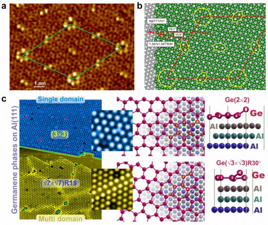 Doping various atoms can introduce totally different influences on the physical properties of germanene. For instance, the adsorption of alkali metal atoms makes semi-metallic germanene become metallic, with the Dirac point moving below the Fermi level and an opened small bandgap at the Dirac point, while the adsorption of halogen atoms could lead to relatively large bandgaps, ranging from 0.416 to 1.596 eV, which is promising for optoelectronic applications [145,146,147]. The adsorption of transition metal atoms (e.g., Ti, Sc, V, Cr, Mn, Fe, and Co) can induce magnetism, while nonmagnetic semiconducting states can be realized for Ni, Cu, and Zn adsorption [148,149]. The atomic structures of germanene can be controlled with supported substrate and growth conditions. Directly grown on a Ag(111) surface, two distinct phases of germanene can be observed: one shows a striped phase, a honeycomb lattice partially commensurate with the substrate; the other is a quasi-freestanding phase, a honeycomb lattice incommensurate with the substrate [150]. By epitaxially preparing it on Ag(111) thin-film grown on Ge(111) with a segregation method, the germanene shows a highly ordered long-range superstructure with two types of protrusions (hexagon and line), resulting in a (7√7 × 7√7)R19.1° supercell with respect to Ag(111) (Figure 8a,b) [151]. However, the single domain (3 × 3) and multidomain (√7 × √7)R(±19.1°) of germanene can exist simultaneously on an Al(111) surface (Figure 8c) [152]. On MoS2 substrate, germanene islands can be formed at high deposition rates, whereas Ge atoms prefer to intercalate between MoS2 layers to form Ge clusters at low deposition rates [147,153]. On a Au(111) surface, honeycomb (1 × 1) germanene with a buckled structure was identified in a (√7 × √7) superstructure, exhibiting distinctive vibrational phonon modes and enhancing electron–phonon coupling induced by the tensile strain [154].
