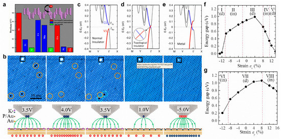 Transition metal-doped black phosphorene possesses dilute magnetic semiconducting properties. In particular, the substitutional doping of Ti, Cr, and Mn can create a spin-polarized semiconducting state, while a half-metallic state is realized via V- and Fe-doping (Figure 10a) [168]. Both Fe-doping and N-doping can significantly improve the electrocatalytic activity of black phosphorene for nitrogen reduction reactions [169,170]. For blue phosphorene, B-doping and C-doping can both improve the sensitivity of NH3 gas molecules, and the sensitivity of CO gas molecules can be enhanced by B-doping [171]. With a monotonic increase in an external electric field, black phosphorene can transition from a normal insulator to a topological insulator and, eventually, to a metal (Figure 10c–e) [172]. In addition, an external electric field can realize reversible potassium intercalation in a blue phosphorene–Au network (Figure 10b) [173]. When axial strain is applied in the zigzag or armchair direction, the bandgap of black phosphorene will exhibit a direct–indirect–direct transition (Figure 10f,g) [51]. Moreover, a topological phase transition of black phosphorene can be realized via the application of compressive biaxial in-plane strain and perpendicular tensile strain [174].