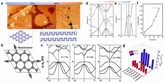 Substrate temperatures can modify the formation of arsenic nanostructures. On Au(111) substrate, the arsenic monolayer formed by 0D tetrahedral As4 clusters can transform into a monolayer formed by 1D armchair arsenene nanochains (Figure 11a) [32]. The application of biaxial tensile strain can effectively tune the band structures of arsenene. Under low tensile strain, arsenene can transform from an indirect to a direct bandgap (Figure 11b,c) [24]. By further enlarging the tensile strain, the direct bandgap will gradually disappear, causing band inversion at the Γ point (Figure 11d,e) [177]. The consideration of SOC can open a spin-orbit bandgap (~131 meV) under a tensile strain of 18.4% (Figure 11f), indicating a QSH effect in arsenene [177]. Intriguingly, under proper biaxial tensile strain and electron-doping, arsenene can be superconducting, with a Tc of 30.8 K [178]. Indeed, 3D-transition-metal-doping can strongly tailor the electronic and magnetic properties of arsenene. Ti-, V-, Cr-, Mn-, and Fe-doping can induce magnetic states for arsenene [180]. Meanwhile, Ti- and Mn-doping leads to a half-metallic state, while V-, Cr-, and Fe-doping results in a spin-polarized semiconducting state [180]. In addition, doping can further modify chemical properties, making arsenene potentially useful for hydrogen evolution and oxygen evolution reactions (Figure 11g) [181].
