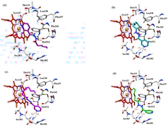 | 5 | −6.2 | Met512 with the nitrogen of Hydrazide group | Leu130, Thr131, Hist382, Ser383 and Phe242 with hydrophobic chain and the pyridine ring, π-π stacking interaction between Tyr127 and the pyridine ring |
