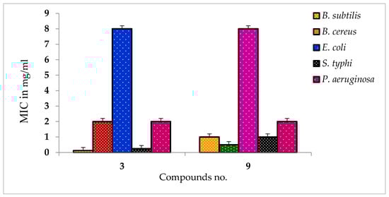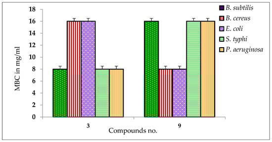 The antibacterial effects against the pathogens were determined by measuring the values of MIC and MBC of the most active β-MGP analogs. The results are listed in Table S2 and Figure 1 and Figure 2. The best antibacterial effects against the tested strains were observed for derivatives 3 and 9, which showed MIC values in the range of 0.125–8.0 mg/L. Both the derivatives were active against all tested bacteria, and the best activity for these compounds was recorded against B. subtilis (0.125 mg/L). The lowest value of MBC was obtained for both derivatives (8.00 mg/L) against all pathogens. The highest value of MBC (16.00 mg/L) was obtained for derivative 9 against B. subtilis, S. typhi, and P. aeruginosa. The MBC values for these compounds for the other tested organisms are in the range 8–16 mg/L.