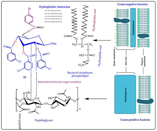The SAR study was performed for β-MGP derivatives based on their antimicrobial results, where compound 6 was found as the most active molecule for all the tested organisms. The SAR outcomes clarified that the insertion of several electron-enriched and electron-deficient groups firstly in the C-5 position and finally on the C-2, C-3, and C-4 positions of β-MGP structures markedly enhances the antimicrobial ability of the synthesized compounds. The external membrane of the Gram-negative organism consists of phospholipids, that have a pure hydrophobic property. Compound 6 was modified with a long hydrocarbon chain at the C-5 position which was also capable of hydrophobic interaction. As a result, hypothetically, it was suggested that compound 6 made hydrophobic interaction with the outer phospholipid membrane of bacteria. The 4-chlorobenzoyl benzoyl ring joined at the C-2, C-3, and C-4 positions and also followed the same procedure to show its antibacterial activity (Figure 3). Again, in the Gram-positive strain, compound 6 enters the bacterial membrane via a fatty peptidoglycan ledge (Figure 3). Here also may happen a hydrophobic interaction between the sugar environment of β-MGP analogs 6 and the peptidoglycan part of the cell wall. The rest of the inhibiting mechanism is often identified as being found in Gram-negative strains. The whole result suggested that this type of mechanistic approach may also be validated for compounds 3, 8, and 9.