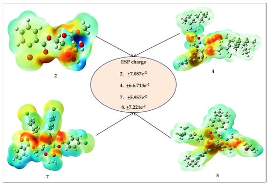 The molecular electrostatic potential (MESP) can identify ligands or protein binding areas and establish a suitable site for an electrophilic attack or nucleophilic attack. [41]. It may be used to determine how complete charges (both positive and negative) are scattered over the surface of an individual molecule [42]. The MESP of all β-MGP analogs was determined by geometry optimization using the B3LYP/3-21G basis set as shown in Figure 5. MESP is important as it can simultaneously show the molecular size and shape, as well as positive, negative, and neutral electrostatic potential regions in terms of color grading, which is crucial in the research of molecular structures, along with the physicochemical properties’ relationship [43]. MESP was calculated to forecast the reactive sites for the electrophilic and nucleophilic attack of the optimized structure of β-MGP (1) and derivatives 2, 4, 7, and 8. The red color displays the maximum negative area, which shows favorable sites for electrophilic attack, the blue color indicates the maximum positive area favorable for the nucleophilic attack, and the green color represents zero potential areas.