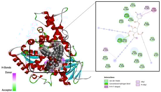 Free energy values of a molecule help determine the spontaneity of the reaction which reveals the stability of a product [38]. A higher (−)ve score is indicated to obtain thermodynamic stability. Compound 6 displayed the maximum free energy score (−6025.325 Hartree) as well as the maximum enthalpy score (−6025.324 Hartree) and maximum electronic score (−6025.445 Hartree) among all β-MGP analogs. A large value of dipole moment refers to the broadly polar nature of a molecule [39]. As summarized in Table S3, compounds 2 and 5–8 have a fluctuating dipole moment score, which consequently affects the polar nature of a molecule, and modifies the binding energy, and binding mode of the ligand against the receptor protein. The value of dipole moments varied from a minimum of 3.321 Debye to a maximum value of 8.574 Debye. These results indicated that the change in hydroxyl (-OH) groups of β-MGP can finely raise the thermodynamic features of its analogs.
