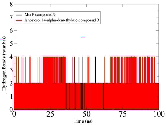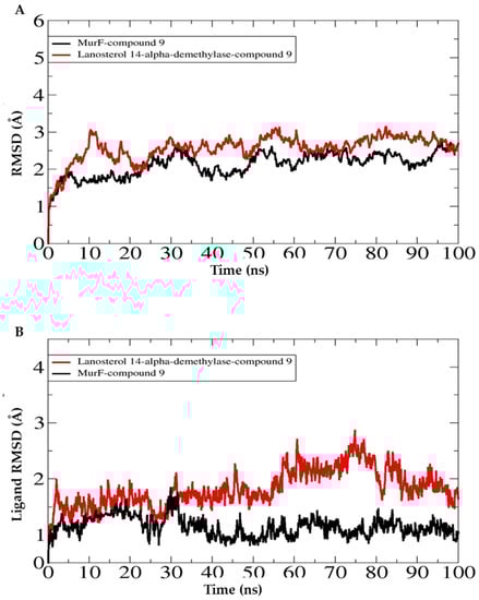 The selected complexes were further subjected to molecular dynamics simulations to determine the dynamics of the complex and binding stability of derivative 9 with the antibacterial and antifungal receptors. To examine the structure dynamics stability of the complex, root means square deviations (RMSDs) of both receptors and derivative 6 were calculated throughout 100 ns. The root means square deviation of the C-alpha atoms found during dynamics was explored to realize the stability and the structural difference [32,33,34]. Figure 8 reveals that the analyzed analogs had the initial upper trend causing the flexible nature of the protein–ligand complexes at the starting stage. As a result, the protein–ligand complexes gained the steady-phase after 25 ns and continued to gain stability until the last segment of the simulations. Compound 9 showed reasonably higher RMSD than the other docked complexes, revealing the promising flexible property of all the complexes than other analogs. Therefore, all the protein–ligand complexes had RMSD less than 2.0 during the dynamics performance, resulting in the complexes’ stability. Both systems had noticeably good overall structural stability as no major deviations were pointed out. Some small RMSD jumps can be observed; however, these changes do not alter compounds binding to the receptors. These changes are, in fact, due to the large number of loops that allow flexibility of the receptors. The mean RMSD value of MurF-derivative 9 and lanosterol 14-α-demethylase-derivative 9 is 1.98 Å and 2.64 Å, respectively. Similarly, the RMSF analysis indicated the major receptors’ residues were stable in the presence of derivative 9. This demonstrates favorable binding of the compound to the receptors, which allows for a stable compound binding mode to the receptors. The mean RMSF value of MurF-derivative 9 and lanosterol 14-α-demethylase-derivative 9 is 1.02 Å and 2.2 Å, respectively. The RMSD and RMSF plots of the systems are presented in Figure 8. Further, it is demonstrated that the strong binding of derivative 9 with the receptor is attributed to the continuous formation of hydrogen bonds between the compound’s chemical moieties receptor and active site residues. In Figure 9, the derivative interacts with the receptor’s residues with at least two hydrogen bonds along the length of simulation time. The analysis of the complex stability of systems was also conducted by calculating the radius of gyration (Rg) and solvent-accessible surface area (SASA). The radius of gyration is the mass-weighted root mean square distance of the collection of atoms from their common center of mass. Rg is one of the important parameters to analyze the stability of proteins using MD simulation data. Figure 10A indicates that all complexes had an identical Rg score; again, lower degrees of deviation were found for the four simulated complexes. The solvent-accessible surface area of the simulations systems was explored to understand the changes in the protein surface area where the higher SASA (Figure 10B) defines the expansion of the surface area. In contrast, the lower SASA is related to the truncated nature of the complexes. The root means square fluctuations define the flexible nature of the complexes across the amino acid residues. Figure 10C reveals the stable nature of the complex of compound 9.