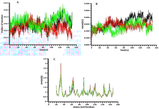 The molecular dynamics simulation trajectories: here, (A) radius of the gyration of the complexes; (B) solvent-accessible surface area of the docked complex to understand the change in protein area; (C) root mean square fluctuation.