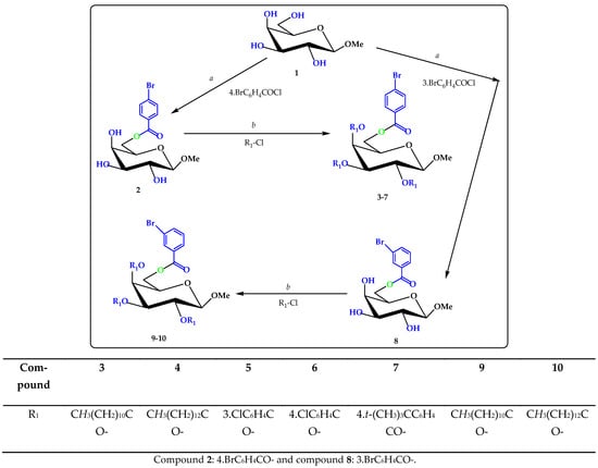 The research work reported here aimed to carry out regioselective bromobenzoylation of β-MGP (1) (Scheme 1) and transformation of the synthesized 6-O-(4/3-bromobenzoyl) (2/8) into a number of substituted derivatives (Figure S1). This 6-O-(4/3-bromobenzoyl) (2/8) and its 2,3,4-tri-O-acyl derivatives (2–10) were employed as the test compound’s antimicrobial screening, along with the prediction of PASS and in silico studies.