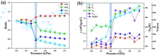 (a) Pressure dependence of lattice parameter ratios and volume ratio. (b) The pressure dependence of density (ρ), average sound velocity (Vt), longitudinal sound velocity (VI), average wave velocity (Vm), and Debye temperature (θD) of ZIF-4.