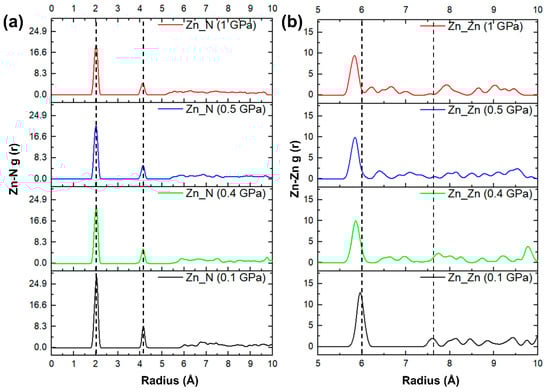 The lattice parameters and mechanical properties discussed above indicate that for ZIF-4, 0.4 GPa is a “watershed” in hydrostatic pressure rises from 0 to 1 GPa. To reveal changes in the lattice parameters and mechanical properties near 0.4–0.5 GPa, the structures of ZIF-4 at 0.1, 0.4, 0.5, and 1 GPa were further characterized. The radial distribution function (RDF) in Figure 4 shows a mid-range structural shift at 0.4–0.5 GPa. When the pressure is smaller than 0.4 GPa, the compression of the structure corresponds to the contraction of the pores, and the difference in the distribution of the Zn-Zn bond lengths is slight. When the pressure increases to 0.4–0.5 GPa, the change in the form of the mid-range connections is reflected in the further reduction in Zn-Zn bonds. The Zn-Zn bond lengths at 0.9 GPa and above do not change further than at 0.5 GPa. In the short-range structure presented by the Zn-N pair RDF in Figure 4a, there is little change under different pressures. From this, we deduce that the anomaly of decreasing ductility and plasticity of the ZIF-4 structure with increasing pressure is due to the transformation in the way the [ZnN4] tetrahedra are connected. The change in the mid-range order explains the sudden change in the mechanical properties of silicates with similar [SiO4] tetrahedral network structures [,].