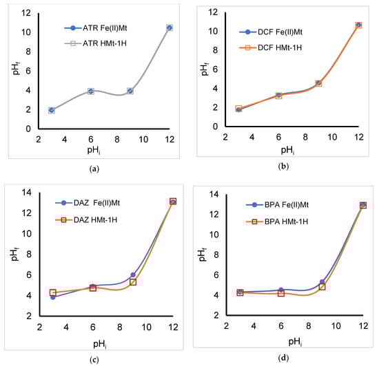 Final pH (pHfinal) versus adjusted pH of the aqueous solutions of ATR (a), DCF (b), DAZ (c) and BPA (d) containing the clay suspensions.