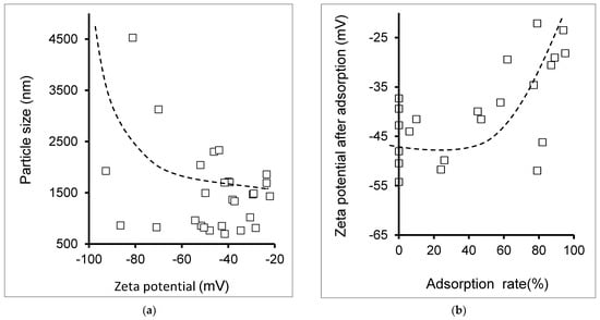 Effect of the Zeta potential on the particle size of Fe(II)Mt and HMt-1 (a) and of the adsorption rate on the Zeta potential after adsorption (b) for all the organic species.