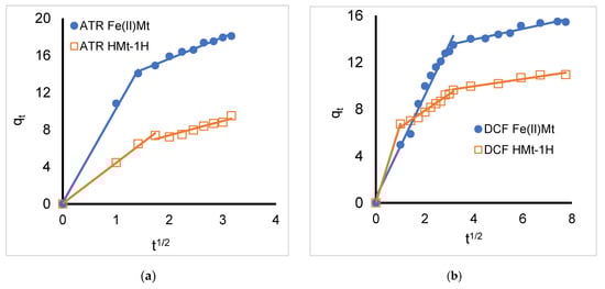 An overview of the dependence qt = f(t1/2) [] revealed the occurrence of successive domains of linearity with progressively decreasing slopes except for BPA whose adsorption kinetics does not seem to clearly fit the model (Figure 3). ATR and DAZ adsorption was characterized by two intra-particle diffusion steps on both clay adsorbents. DCF adsorption on Fe(II)Mt showed two diffusion steps after 60 min and three steps in the presence of HMt-1.