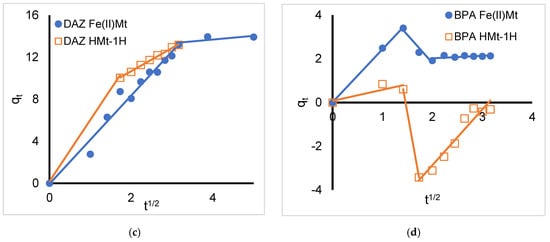 Application of the intra−particle diffusion model to adsorption on Fe(II)Mt and HMt-1 in the aqueous solutions of ATR (a), DCF (b), DAZ (c) and BPA (d). Adsorption was achieved in 30 mL of aqueous clay suspension with initial concentration of organic substrate of 30 mg L−1 at intrinsic pH; T = 21 ± 2 °C; Adsorbent amount = 40 mg; Contact time = 10 min.