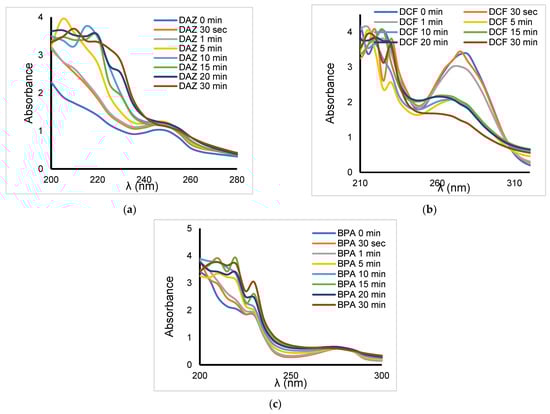 Evolution of UV-Vis spectra of the aqueous solutions of DAZ (a), DCF (b) and BPA (c) during non-catalytic ozonation at room temperature. V = 30 mL, Quartz cell length = 1 cm; Ozone throughput = 600 mg h−1; Initial concentration of organic substrate = 30 mg L−1.
