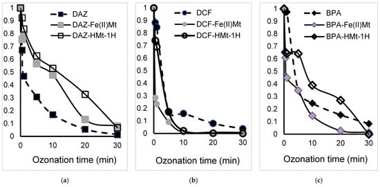 Clay catalyst addition induced a noticeable acceleration of the ozonation process, more particularly for DCF and BPA. Their almost total disappearance of the substrate HPLC-UV peak (less than 1% residual amount) was observed after only 10 min of ozonation in the presence of Fe(II)Mt and 20–25 min with HMt-1 (Figure 4). The paradoxically lower DAZ conversion rates as compared to the non-catalytic ozonation is not due to an inhibiting effect of the catalyst, but rather to a competitive ozone consumption in side-reactions as suggested by the rise of a fourth intermediate (Table 5).