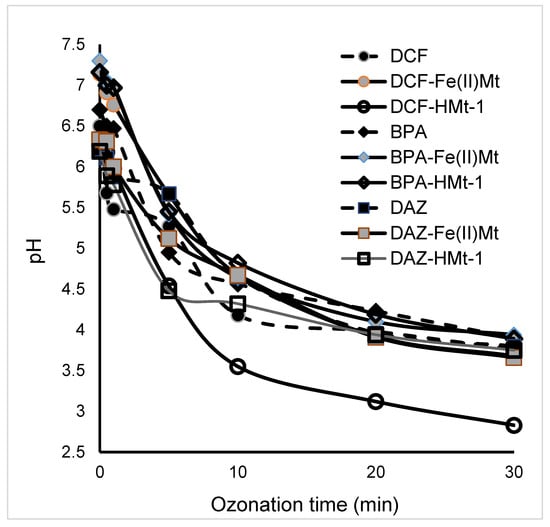 The gradual pH decrease observed during ozonation of the investigated organic substrates is due to the progressive production of oxidized derivatives that include carboxylic acids (Figure 7). The fastest and most pronounced pH decrease was noticed for HMT-1-catalyzed DCF ozonation. This accounts for enhanced ozonation as supported by the total removal rate of this substrate (Table 1).