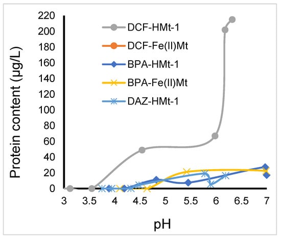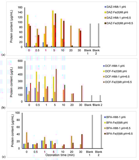 Another ecotoxicity parameter resides in measuring the protein content. Immersion of Lemna minor individuals in ozonized DCF aliquots at pH adjusted to 6.5 induced an overall increase in protein content except for DCF-HMt-1 mixture (Figure 8). The latter showed a consecutive and fast depletion of the protein content after less than 10 min. Increase in protein content accounts for protein synthesis despite the oxidative stress produced by the first 5 min of ozonation in the presence of Fe(II)Mt and HMt-1 catalysts. A possible explanation consists in a beneficial effect of optimum availability of Fe2+ cation at pH 6.5 for plant growth []. This suggests that iron-containing clay-rich soils may mitigate the effect of ecotoxicity during the first stages of oxidative decomposition of organic pollutants. This still remains to be elucidated through deeper biological investigations.