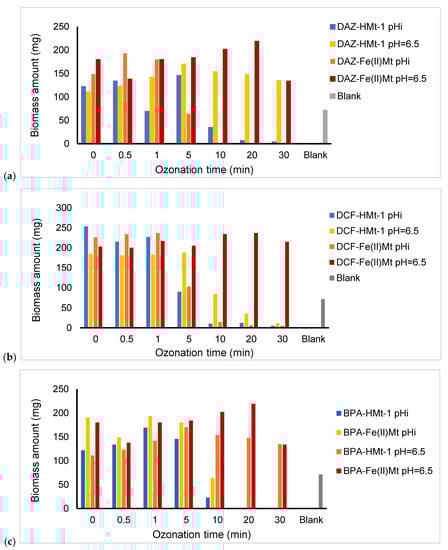The fact that all organic substrate mixtures ozonized in the presence Fe(II)Mt still produce high BA decay as compared to the blank suggests a key-contribution of iron (II) cations. Slightly weaker BA increase was noticed for DAZ-HMt-1 and BPA-HMt-1 both at pH 6.5, i.e., in the presence of iron-free clay catalyst. Much weaker but progressively depleting BA increase was registered in the present of DCF-HMt-1 at pH 6.5. These results are of great interest because they clearly demonstrate that the toxicity of ozonized media on Lemna minor is strongly influenced by the pH, the occurrence of iron cations, and compositions of both the clay catalyst and organic substrate.