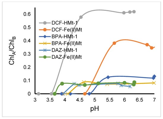 Maintaining the pH at a constant level of pH 6.5 after ozonation was found to attenuate the acid stress that causes the alteration of the pigment composition, as supported by quasi-constant ChlA/ChlB ratios in all aqueous dispersions of clay-substrate mixtures. However, other factors such as changes in iron availability as a micronutrient for plant growth should also be considered. Indeed, acidic pHs are known to produce an excess of cationic iron with potential toxicity, while pHs exceeding 6.5–7.2 induce iron precipitation and detrimental deficiency for plants.