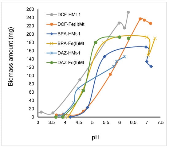 The adsorption equilibrium was studied by applying Langmuir’s (Figure S4, Supplementary Materials) and Freundlich’s (Figure S5, Supplementary Materials) models, respectively, based on purely physical adsorption and adsorption accompanied by a chemical reaction. Here also, clear and high linearity were registered for ATR, DAZ, and DCF adsorption on both Fe(II)Mt and HMt-1 but not for BPA.