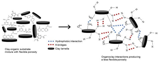 Adsorption equilibrium was attained after impregnation times ranging between 7 and 10 min. Specific retention rate were registered depending to the clay-substrate couple reaching maximum values of ca. 80% for the couple ATR-Fe(II)Mt, 60% for ATR-HMt-1 and DCF-Fe(II)Mt) and 55–56% for DAZ-HMt-1 (Figure S1, Supplementary Materials). BPA showed the lowest adsorption rates on all clay minerals, while KMt and CaMt displayed low affinity towards the organic substrates even almost negligible for ATR.