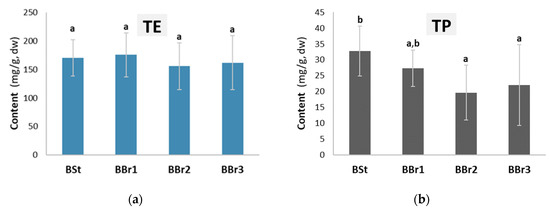 Contents of water-soluble extractives (TE; (a)) and total phenols (TP; (b)) in the stem and branch bark samples of silver fir (Abies alba). Results are expressed in milligrams of extracted compounds per gram of dried bark (mg/g, dw). The different letters a and b at the top of the error bars indicate statistically significant differences at a 95% confidence level (LSD test).