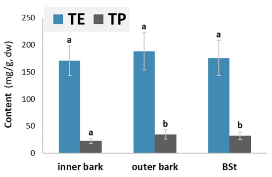 Contents of water-soluble extractives (TE) and total phenols (TP) in inner bark samples, outer bark samples and stem bark samples of silver fir (Abies alba). Results are expressed in milligrams of extracted compounds per gram of dried bark (mg/g, dw). The different letters a and b at the top of the error bars indicate statistically significant differences at a 95% confidence level (LSD test).