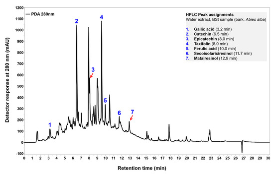 HPLC–PDA chromatogram of silver fir (Abies alba) water extract monitored at 280 nm. Sample of stem bark (BSt). The chromatogram is equipped with the list of separated phenolic compounds.