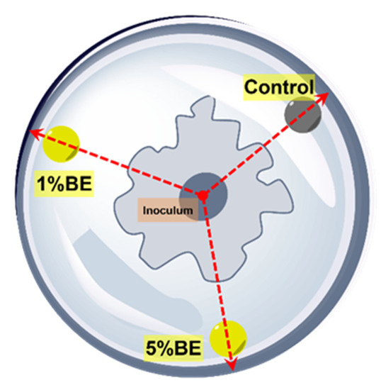 Schematic presentation of in vitro measurement of the inhibition effect of silver fir bark extracts towards wood-decaying fungi (T. versicolor, S. commune and G. trabeum) and moulds (P. expynsum and F. solani). The measurements on each Petri dish were always taken in a defined radial direction (red arrows).