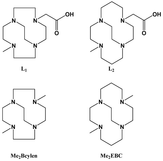 Ligands L1 and L2, inspired by the Me2Bcyclen and Me2EBC analogs.