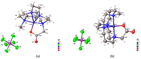 The asymmetric unit of (a) [CuL1]PF6 and (b) [CuL2]PF6 with atoms shown as 50% probability ellipsoids.