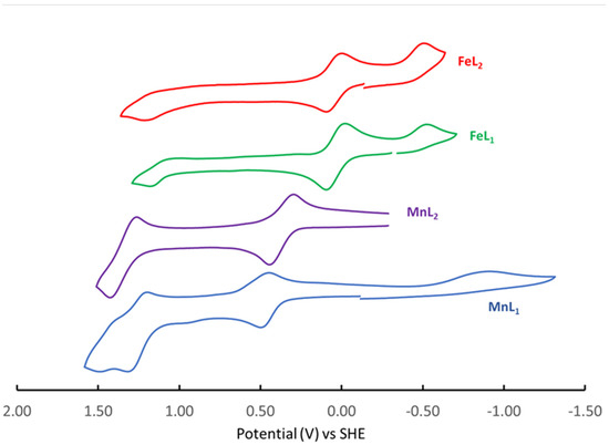 Cyclic voltammograms in acetonitrile with potentials relative to SHE for MnL1 (blue), MnL2 (purple), FeL1 (green), and FeL2 (red).