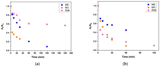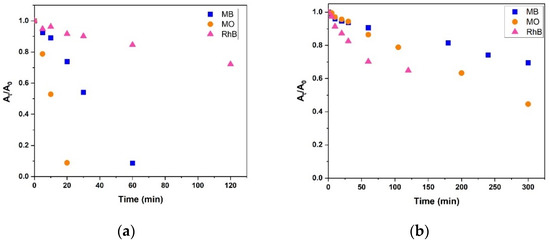 Organic dyes have been widely used for industrial and commercial purposes, e.g., textiles, foods, pharmaceuticals, and cosmetics, as well as in scientific research [1,2,3,4]. However, many organic dyes are potentially toxic, carcinogenic, and often non-biodegradable. At high concentrations, strongly-absorbing dyes can reduce the light that is transmitted through natural bodies of water. Therefore, wastewater-containing organic dyes pose a potential threat to the aquatic environment as well as living organisms, including, ultimately, humans. Consequently, the elimination of organic dyes from wastewater is an environmental, water purification, and reuse necessity.