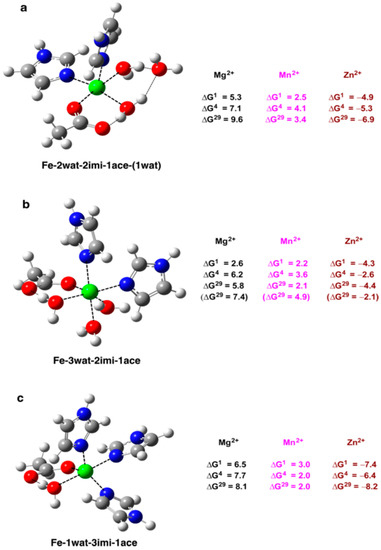 The zinc cation, characterized by greater ligand affinity than Fe2+ (Table 1), can outcompete the iron cation and displace it from its binding sites regardless of their composition, structure and solvent exposure (negative free energies for the Fe2+ → Zn2+ substitution in the entire series of complexes (Figure 2). The results are in line with a number of in vitro experiments showing that, indeed, Zn2+ binds to the host protein with much greater affinity than Fe2+ [42,43,44,45,46]. Note that, although the protein preferentially coordinates to Zn2+ in vitro, it binds and is activated by Fe2+ in vivo [42,43,44,45,46,47]. Inside the living cell, since the protein alone is not able to repel the attacks by the rival Zn2+, it is the cell machinery which, by tightly controlling the metal homeostasis and maintaining the free Zn2+ concentration at very low levels (in the picomolar to femtomolar range [1]), turns the balance in favor of Fe2+ whose free cytosolic concentration is in the micromolar range [1].