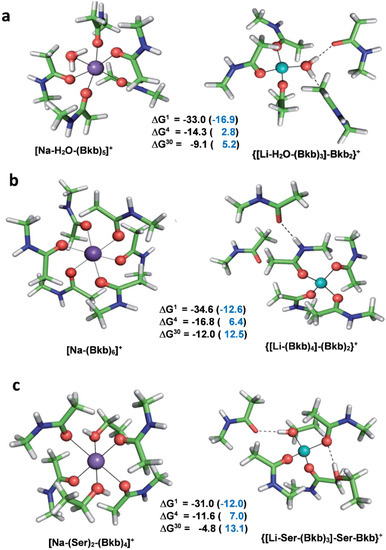 Calculated Gibbs free energies for the Na+ → Li+ exchange (in kcal/mol) and B3-LYP/6-31+G(3d,p) fully optimized structures of Na+ (purple) and Li+ (turquoise) complexes with (a) a water molecule and 5 backbone ligands; (b) 6 backbone ligands, and (c) 4 backbone and 2 serine ligands. ∆G1 refers to cation exchange free energy in the gas phase, whereas ∆G4 and ∆G29 refer to cation exchange free energies in an environment characterized by an effective dielectric constant of 4 and 29, respectively. Free energies for the metal exchange in rigid binding sites are given in parentheses. Positive numbers suggest Na+-selective sites, whereas negative free energies imply the opposite. Backbone peptide groups are modeled as CH3CONHCH3 and the side chains of Ser are represented as CH3CH2OH. Adapted from Ref. [60]. Copyright 2018 Royal Society of Chemistry.