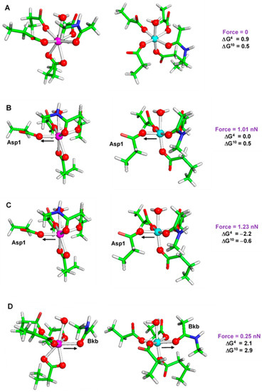 Proteins are dynamic supple objects whose structure and biochemical properties are sensitive to the action of intra- and extracellular forces of varying origin. Applied mechanical forces play a substantial role in essential biological processes, such as cell growth, division, deformation, adhesion and migration [79,80]. The role of the applied mechanical stimuli in modulating the proteins’ performance is still not completely understood. For example, it is not clear to what extent mechanical forces may affect the metal affinity and selectivity of a metal binding site in metalloproteins. Moreover, it is not known whether mechanical forces with varying strength and directionality could be used as a tool to manipulate the metal binding properties of the metal center. This question has been addressed recently by employing M06-2X/6-311++G**//PCM calculations where the effect of applied mechanical stimuli on the competition between Ca2+ and Mg2+ in parvalbumin binding site has been studied [81]. Metal-loaded canonical EF-hand binding sites have been modeled and subsequently subjected to the action of mechanical forces with differing magnitude and directionality. Results are summarized in Figure 9.