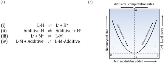 (a) Chemical equilibria controlling crystal growth and termination; deprotonation of linker (i) and additives (ii), complexation (iii) between metal ions and linkers = growth phase, (iv) competition between linker and additive for coordination sites on metal ions = termination phase. (b) Relationship between nanocrystal size, local metal-linker ratios, amount of modulator added and diffusion and complexation rates can be schematically represented in a seesaw model, with Regime I on the left and Regime II on the right side.