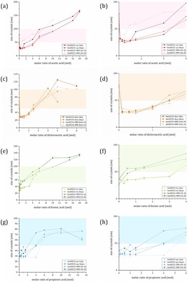 Calculated size of crystal domains plotted against molar addition of used additive; (a) and (b) acetic acid; (c) and (d) dichloroacetic acid; (e) and (f) formic acid; and (g) and (h) propionic acid. Colored ribbon represents a region of 50–100 nm sizes. Graphs on the right side of figure show lower molar additions of acids to emphasize seesaw trend. Error bars are omitted for clarity. Graphs with error bars are found in Supplementary Figure S10.