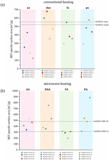 BET surface area of selected materials (a) conventional and (b) microwave heating arranged according to acid used. Colors of the squares are correspondent to the isotherms and pore size distribution presented in Supplementary. Dotted lines represent the BET value of pristine materials.