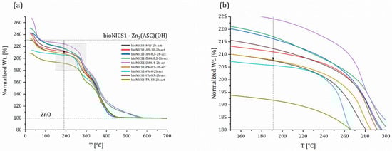 Comparison of thermogravimetric curves of selected, activated bioNICS1 materials crystalized under microwave heating for 2 h (a). Grey rectangle is magnified and presented in (b), where the line and arrow are set to the 191 °C marking the start of degradation of the linker.