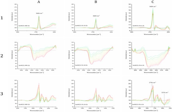 DRIFTS spectra of the specified samples purged with 10 % NH3 in Ar measured from room temperature (red lines) to 150 °C (green lines) shown in three wavenumber regions. Black lines represent the baseline of the activated materials. Represented samples are bioNICS1-MW-2h (A), bioNICS1-FA-18-2h (B) and bioNICS1-PA-6-2h (C).