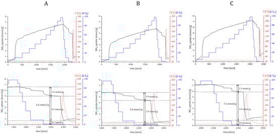 Ammonia sorption kinetics profile of selected materials ((A) bioNICS1-MW-2h; (B) bioNICS1-FA-18-2h; (C) bioNICS1-PA-6-2h) and corresponding inserts (below) showing physiosorbed and chemisorbed fractions of adsorbed ammonia, together with remaining NH3 derivative species. Ammonia dosing pressure—blue line, heating temperature—red line.