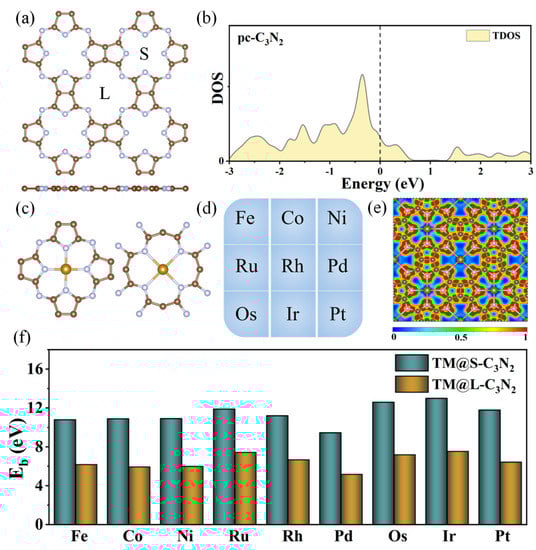 (a) Top view of the pc-C3N2 monolayer. (b) Density of states (DOS) of pc-C3N2. (c) Schematic diagram of doping transition metal (TM) into the small or large cavity. (d) The group VIII TM atoms considered in the current work. (e) The electron location function for TM@C3N2 systems. (f) Binding energy (Eb) of TM atoms doped in the small (TM@S-C3N2) or large cavity (TM@L-C3N2).